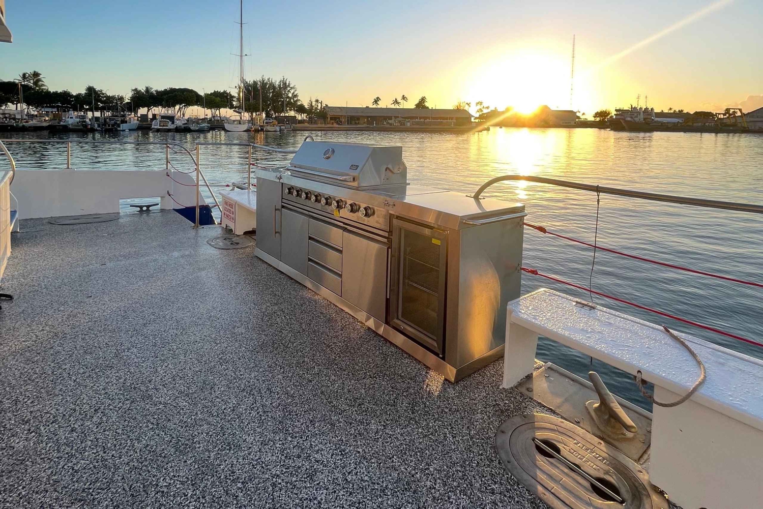 Speziell angefertigter Katamaran: Geräumiger Doppeldecker mit Panoramadecks und einer schattigen unteren Kabine.