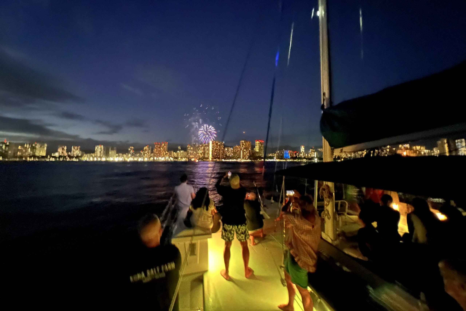 Erlebe die Schönheit eines Sonnenuntergangs in Waikiki und die Aufregung des Freitagsabend-Feuerwerks auf unserer „Sunset Swim and Sail Tour”.