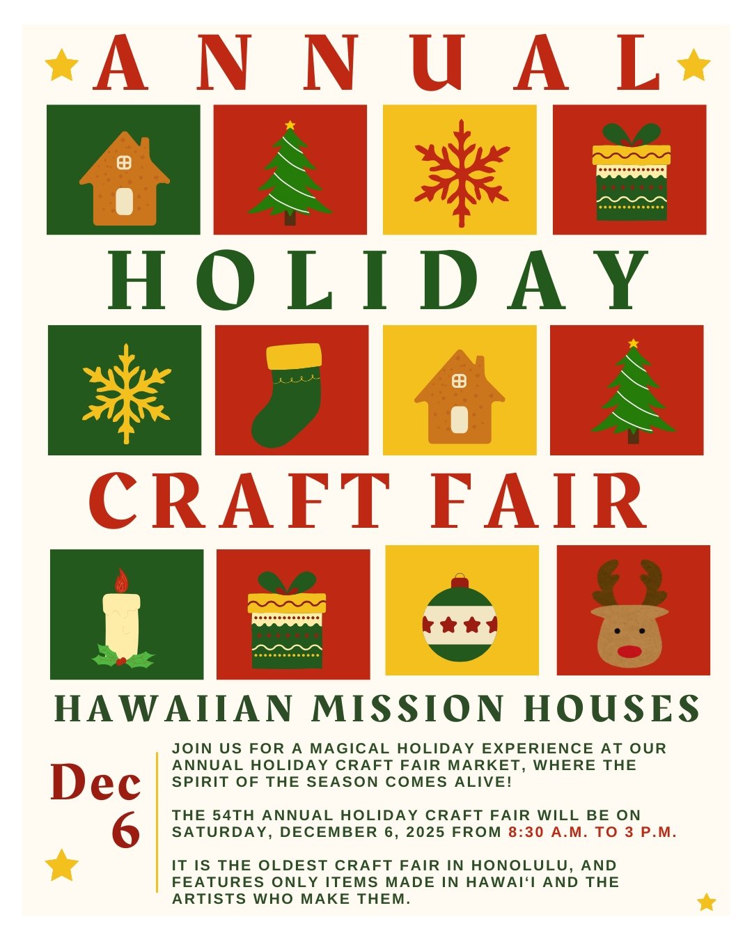 The 54th Annual Holiday Craft Fair, sponsored by the Hawaiian Mission Houses Historic Site and Archives will be on Saturday, December 6, 2025 from 8:30 a.m. to 3 p.m. It is the oldest craft fair in Honolulu, and features only items made in Hawai‘i and the artists who make them. The Holiday Craft Fair is timed to help you get your shopping done early so you can enjoy the season. With over 40 vendors at Hawaiian Mission Houses featuring an array of Hawai‘i-made items, it will be easy for you to find that unique gift for someone special. All items sold are made in Hawai‘i: glass artwork, jewelry, pottery, woodwork, artistic silk scarves, photography, artwork and more! Bring the whole family to enjoy the event and the grounds that surround the oldest houses in Hawai‘i. Parking is available at metered street parking in the neighborhood or at the Fasi Building Municipal Parking lot. See you there!