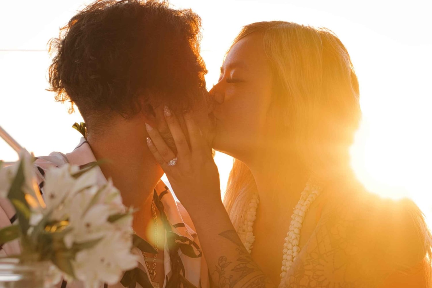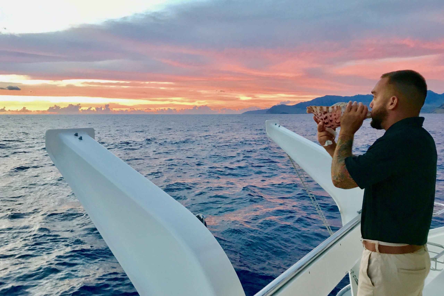 Dégustez de délicieux hors-d'œuvre de style hawaïen et des boissons rafraîchissantes tout en naviguant vers l'envoûtant coucher de soleil hawaïen.