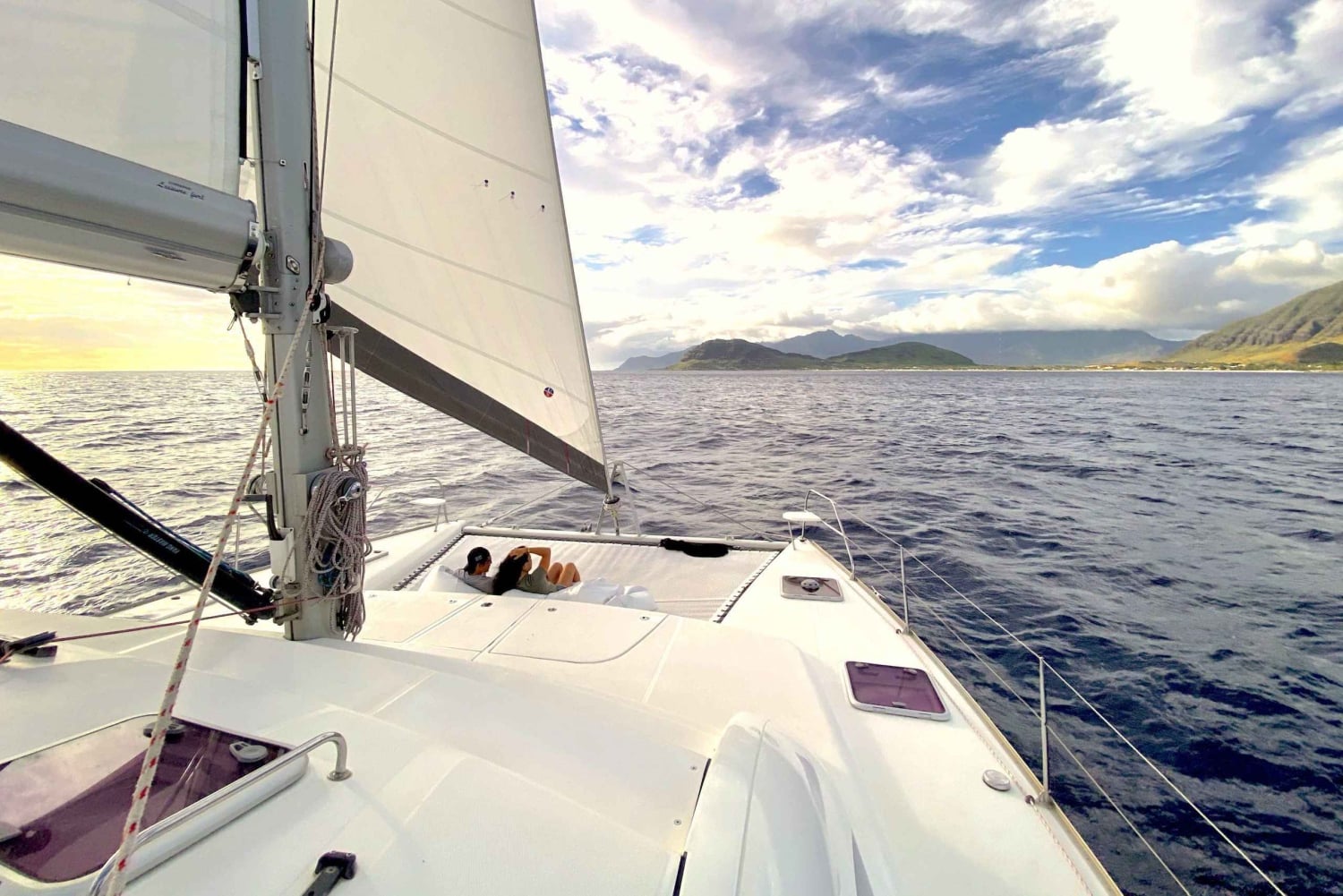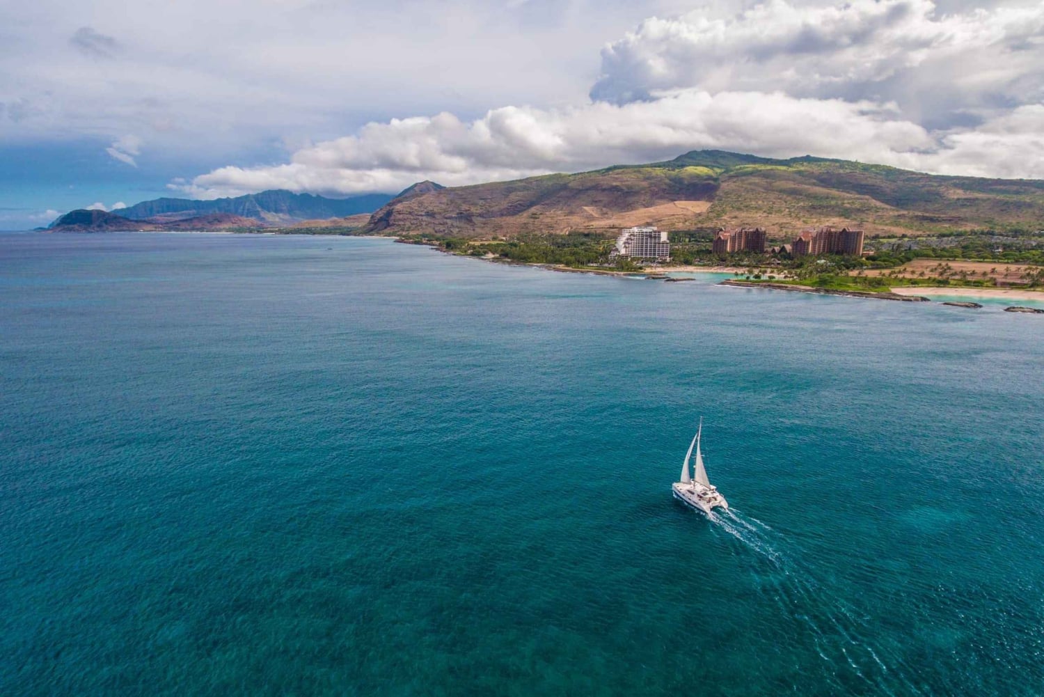 Rejoignez-nous pour une navigation mémorable au cœur du magnifique coucher de soleil hawaïen à bord de notre croisière ' Ko Olina Captain's Sunset + Tasting ' (coucher de soleil et dégustation). Au départ de la marina de Ko Olina, sirotez une boisson et sentez l'excitation lorsque nous hisserons la voile et mettrons le cap sur l'horizon. Ouvrez l'œil pour observer la faune et la flore marines qui peuplent nos eaux, des dauphins hawaïens aux baleines à bosse (en saison) en passant par les poissons volants.
