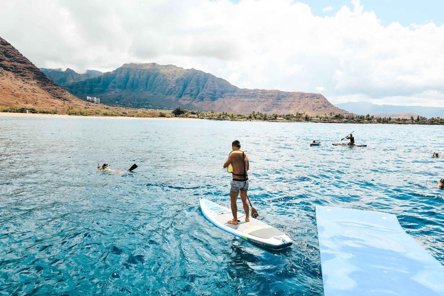 Naviguez le long de la côte ouest d'Oahu à la recherche de dauphins lors de cette passionnante aventure de plongée avec tuba. Vous aurez de multiples occasions de sauter dans l'océan avec les dauphins sauvages qui passent à proximité. Après avoir nagé avec les dauphins, profitez d'un déjeuner local gratuit sur le chemin de notre destination de plongée avec tuba. Une fois prêts, nous nous dirigerons vers la célèbre plage de plongée avec tuba et de surf, Makaha ! Vous pourrez y observer des tortues de mer vertes hawaïennes, des poissons de récif colorés et bien d'autres choses encore ! Vous pourrez également faire l'expérience de plusieurs activités océaniques, comme essayer notre tout nouveau toboggan aquatique de 21 pieds, le Stand-up paddleboard, le kayak et un grand tapis flottant sur lequel vous pourrez vous prélasser. Une fois que vous en aurez fini avec l'eau, vous pourrez vous rincer et vous réchauffer grâce à notre douche chaude ION à bord. Nous vous servirons également du thé vert et du cacao chaud ! Il s'agit d'un événement familial amusant dont vous vous souviendrez pendant des années. Admirez la magnifique côte ouest d'Oahu en longeant le rivage.