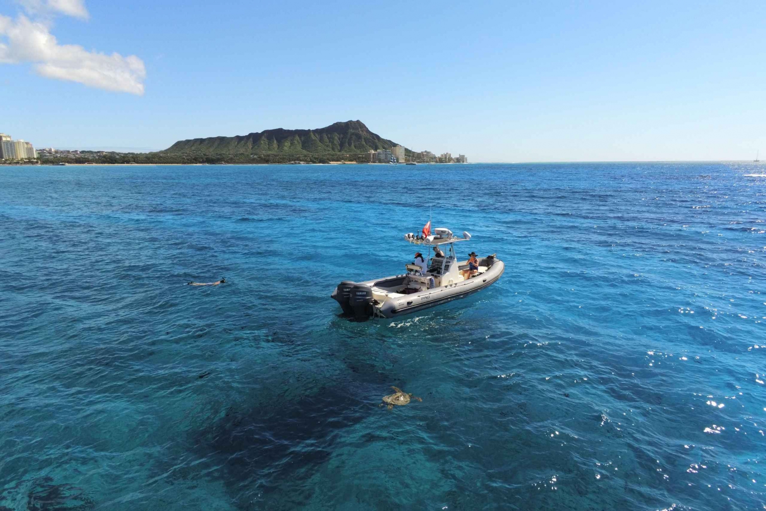 Sfuggi alla folla con un'avventura privata di snorkeling sulla barca più veloce della città. Osserva pesci, tartarughe marine, delfini e balene lungo la costa meridionale di Oahu.