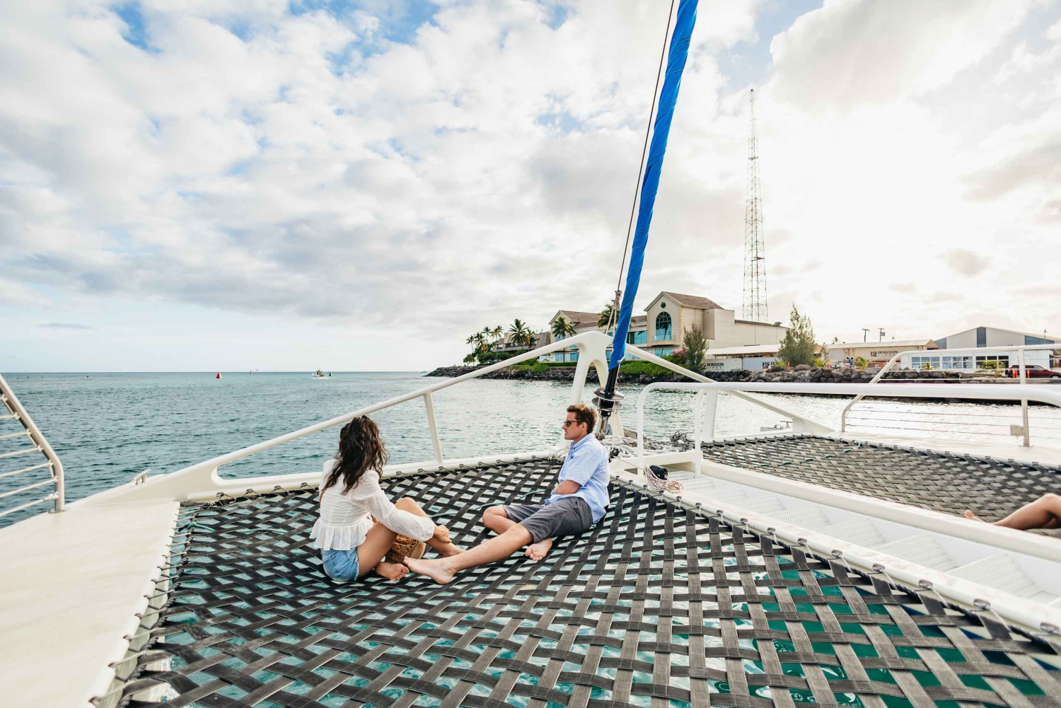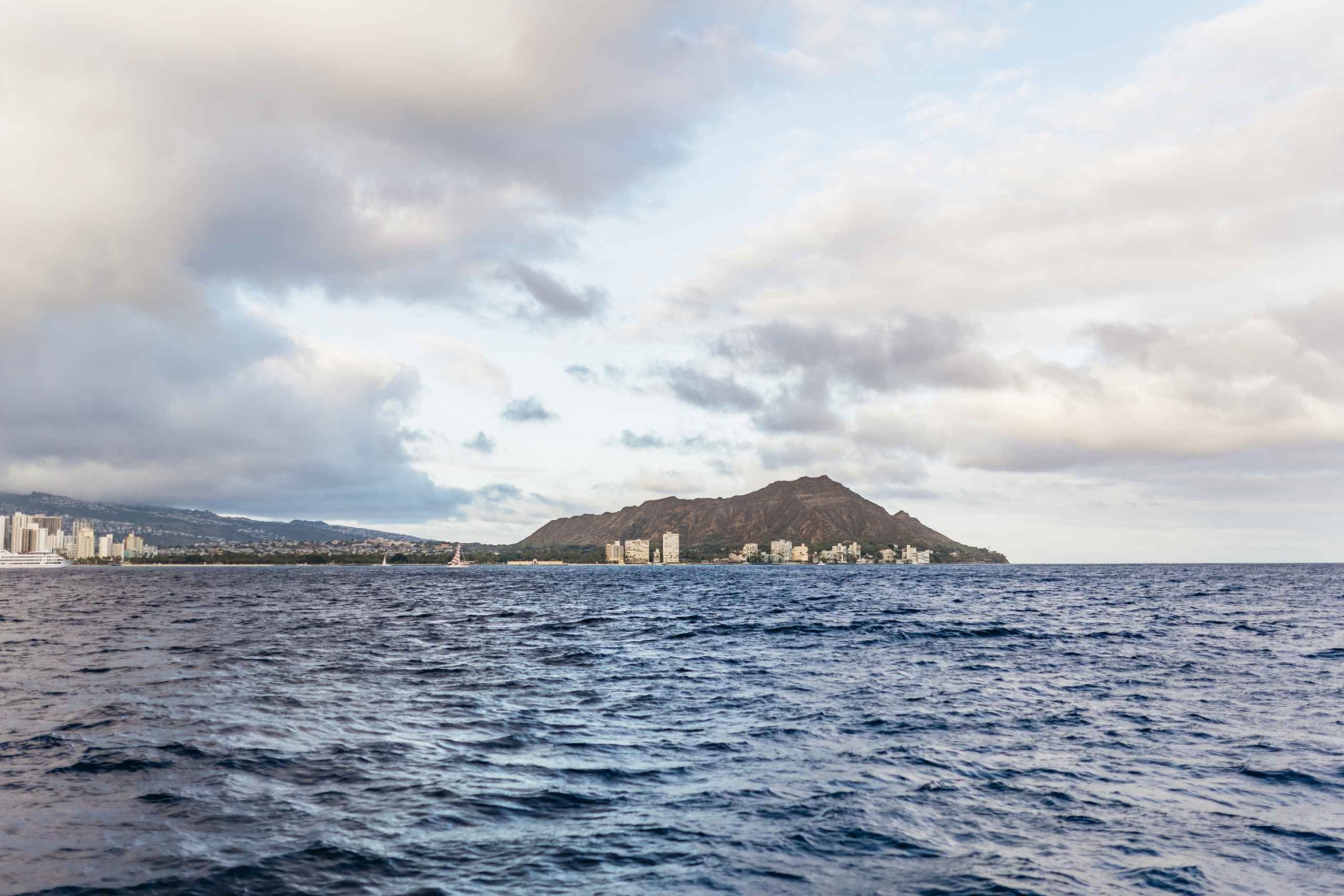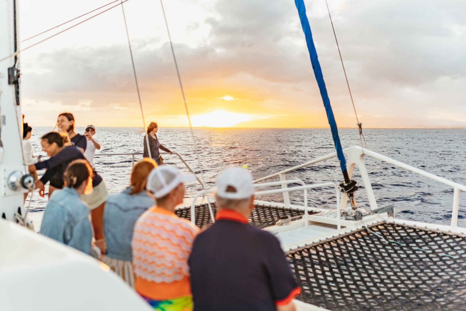 ホノルル発のカタマランクルーズで、ダイヤモンドヘッド火口丘の美しさを水上からご堪能ください。65フィートの双胴船で、夕日を眺めながら、美味しい地元の食べ物と新鮮な海の空気をお楽しみください。