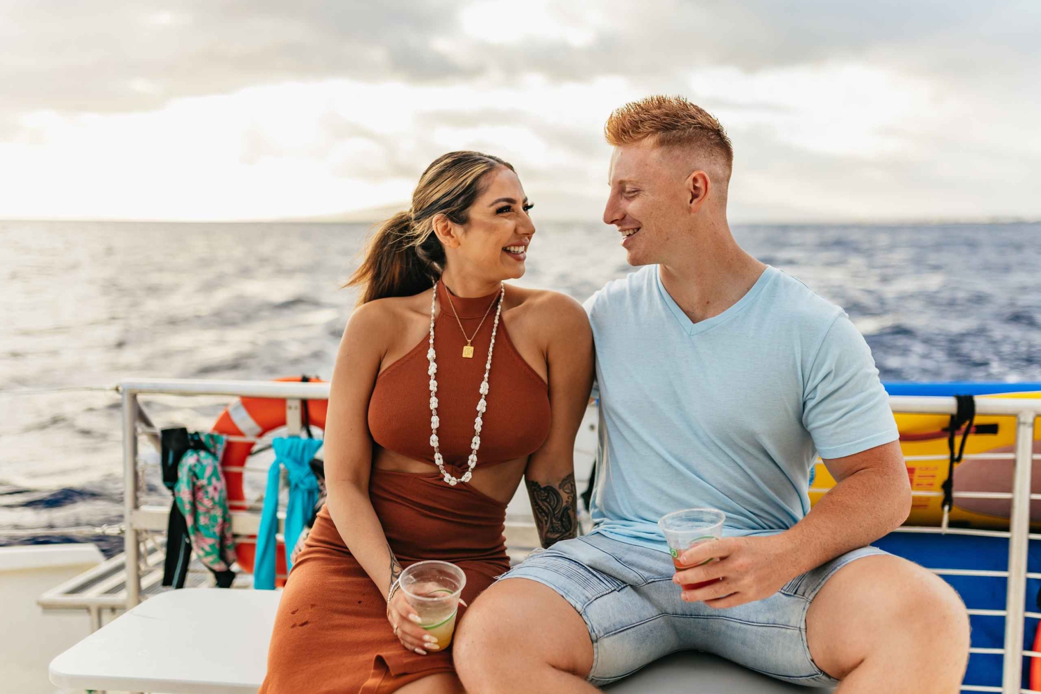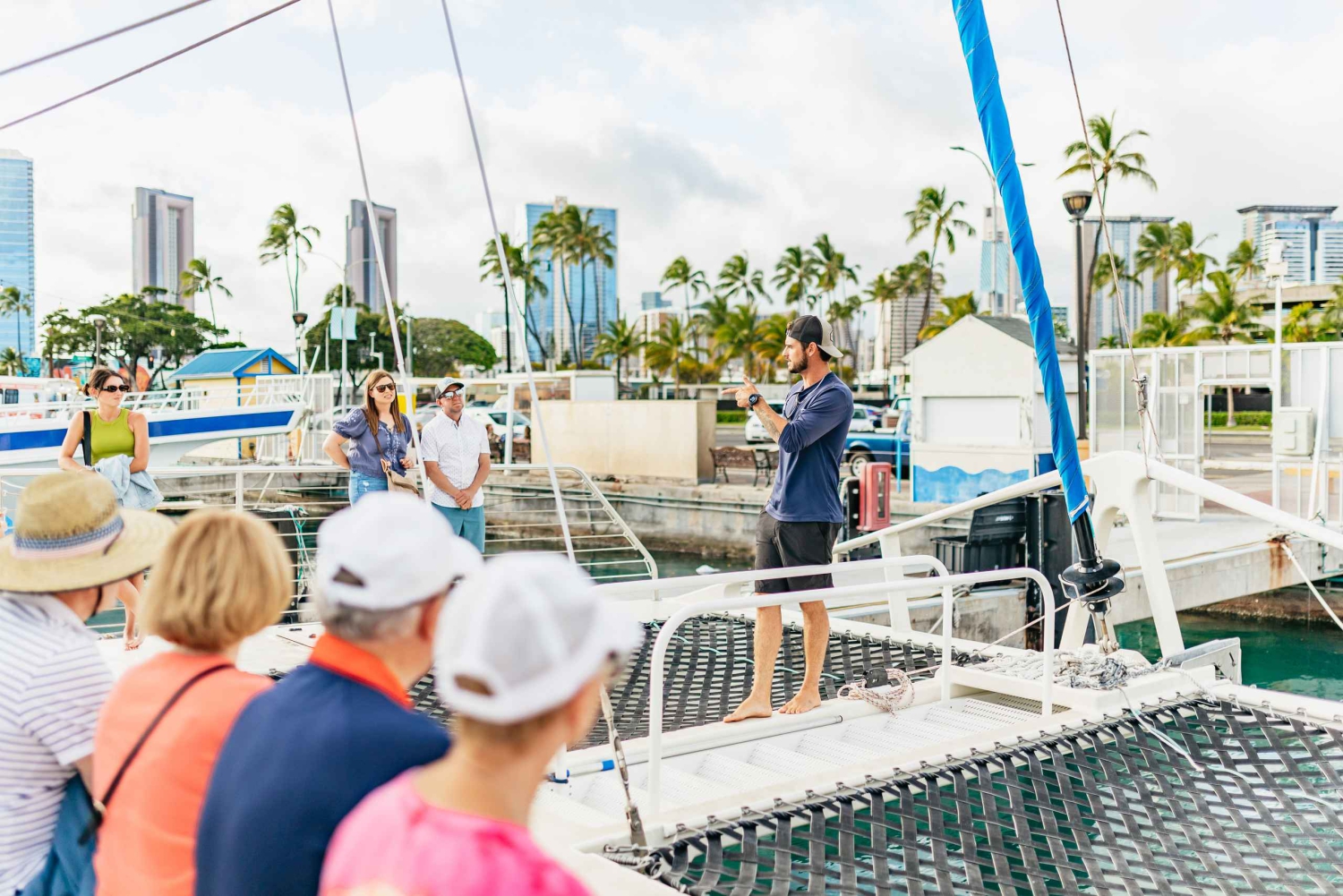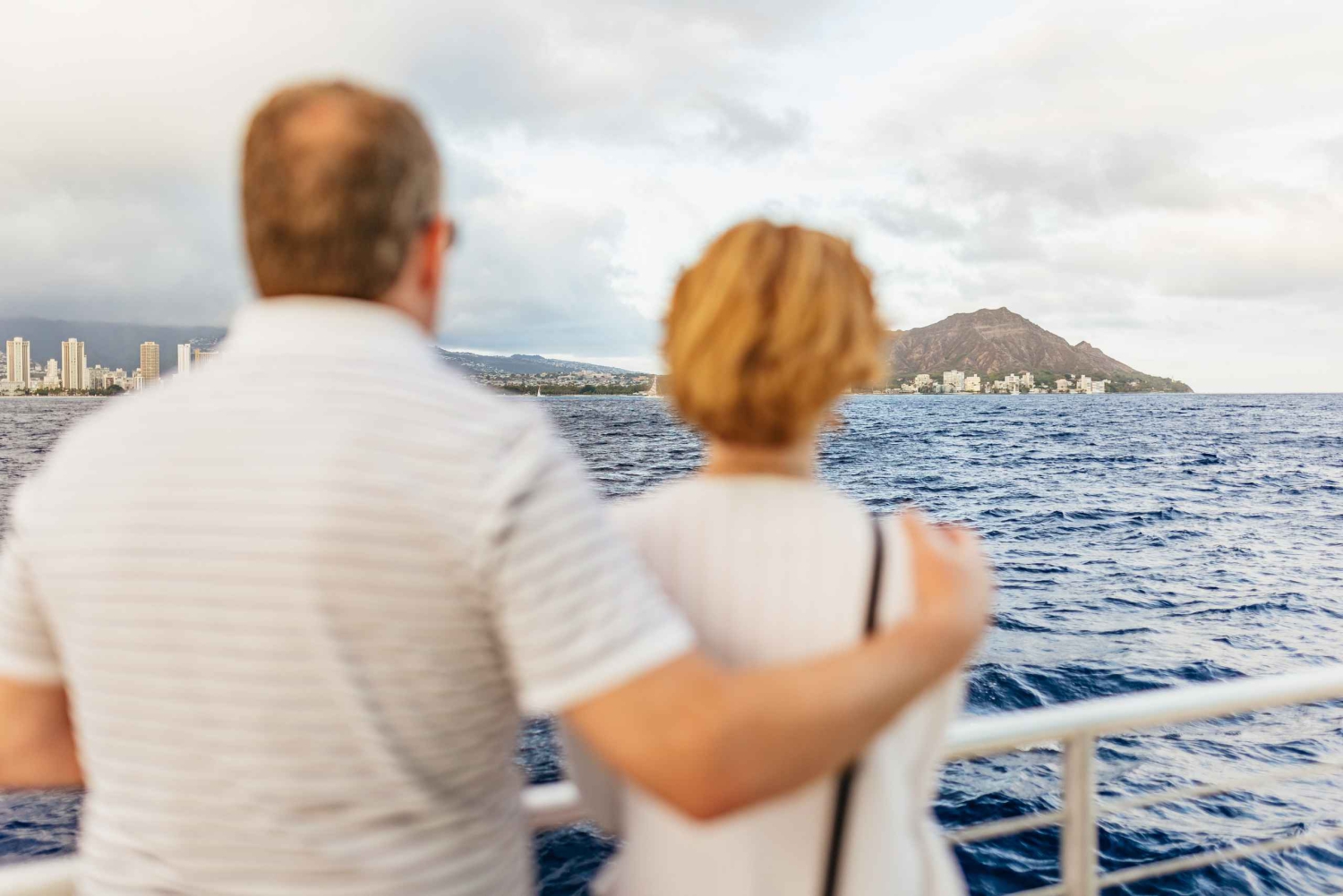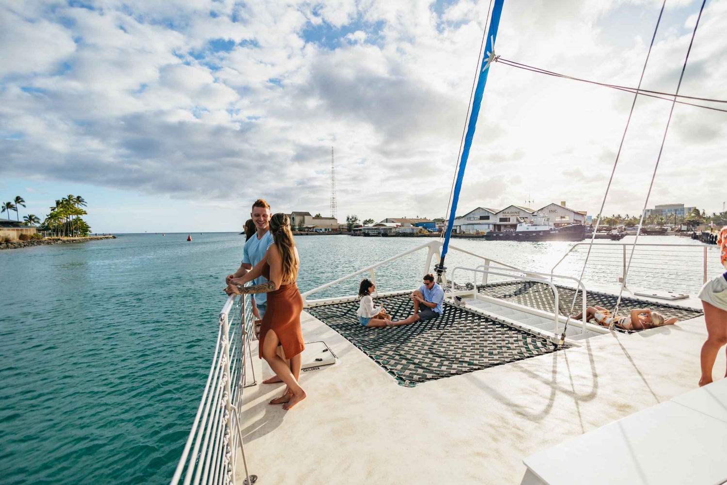 ホノルル発のカタマランクルーズで、ダイヤモンドヘッド火口丘の美しさを水上からご堪能ください。65フィートの双胴船で、夕日を眺めながら、美味しい地元の食べ物と新鮮な海の空気をお楽しみください。