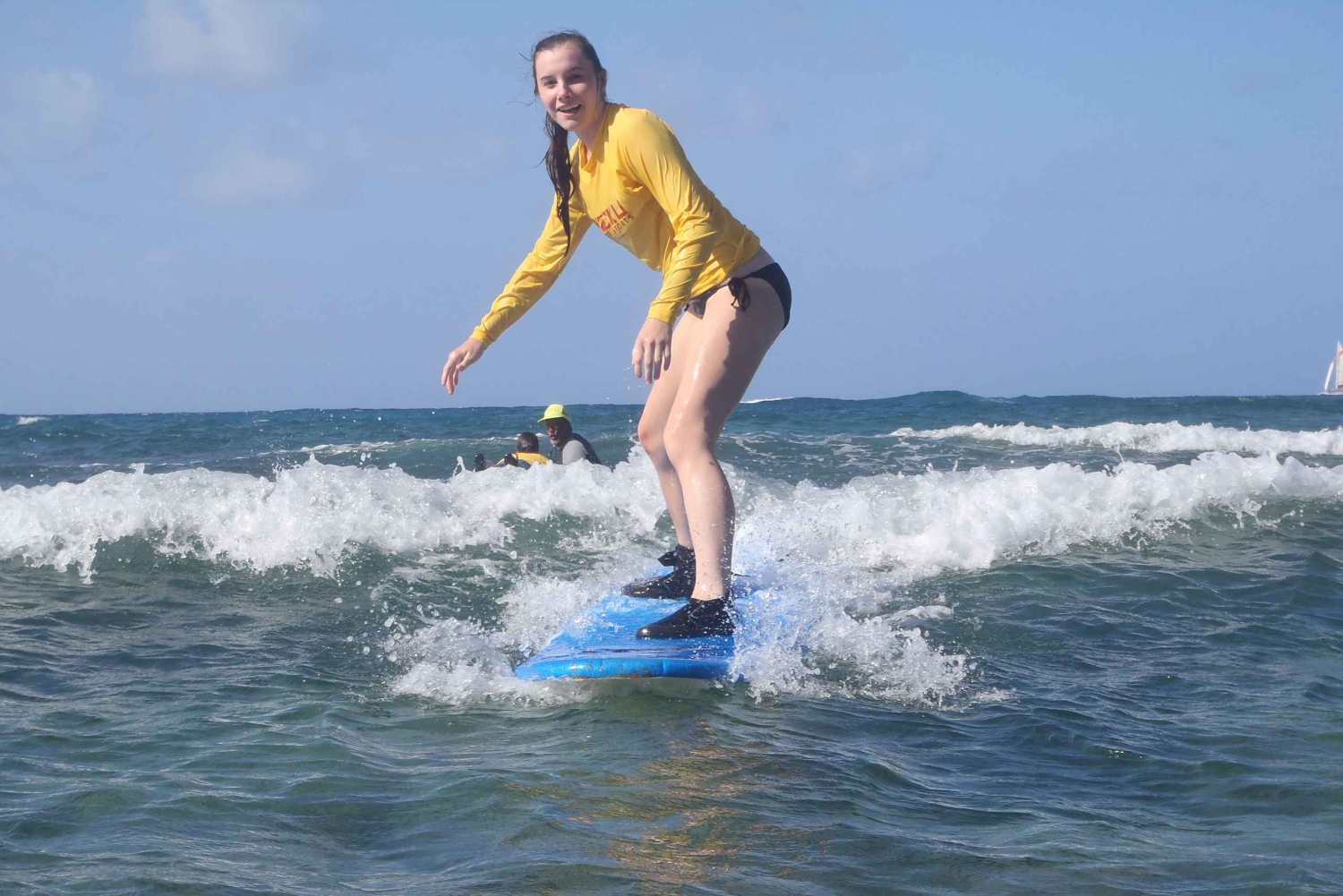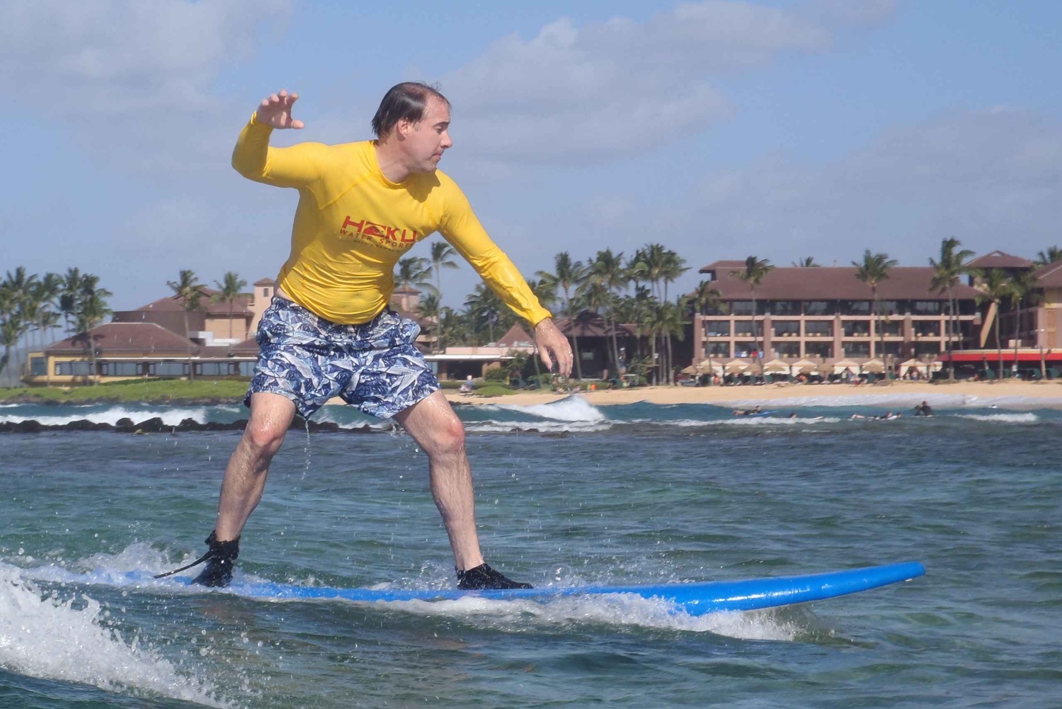 晴れたポイプでサーフィンの技を体験しましょう。陸上のデモンストレーションで経験豊富なインストラクターから基本を学んだ後、初心者向けサーフィンエリアで波に向かって漕ぎ出しましょう。