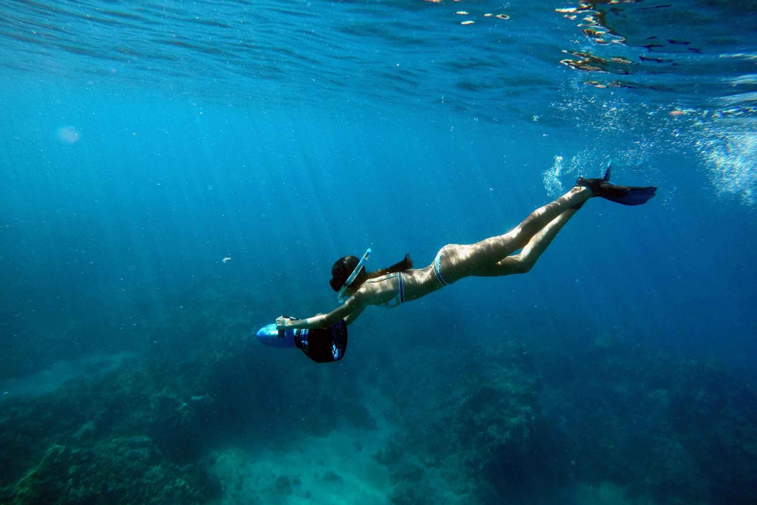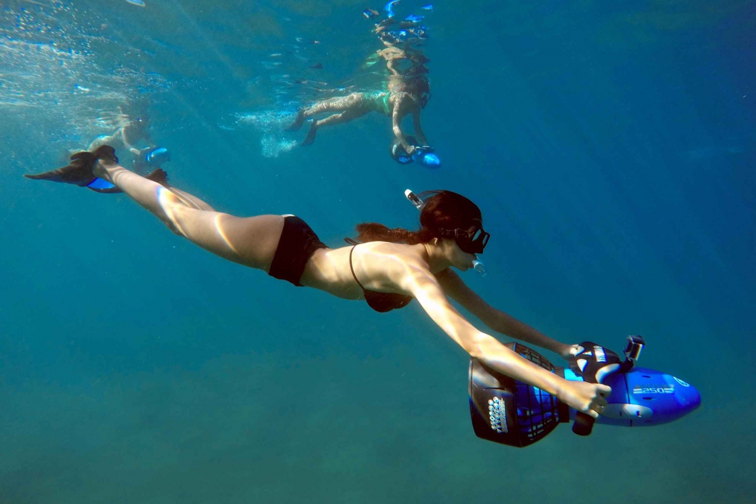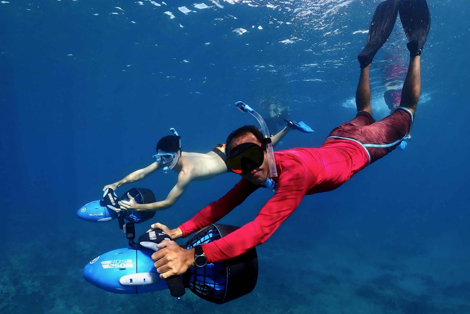 水中スクーターでシュノーケリング。より遠く、より速く移動して、この地域のサンゴ礁やその他の海洋生物を観察しましょう。