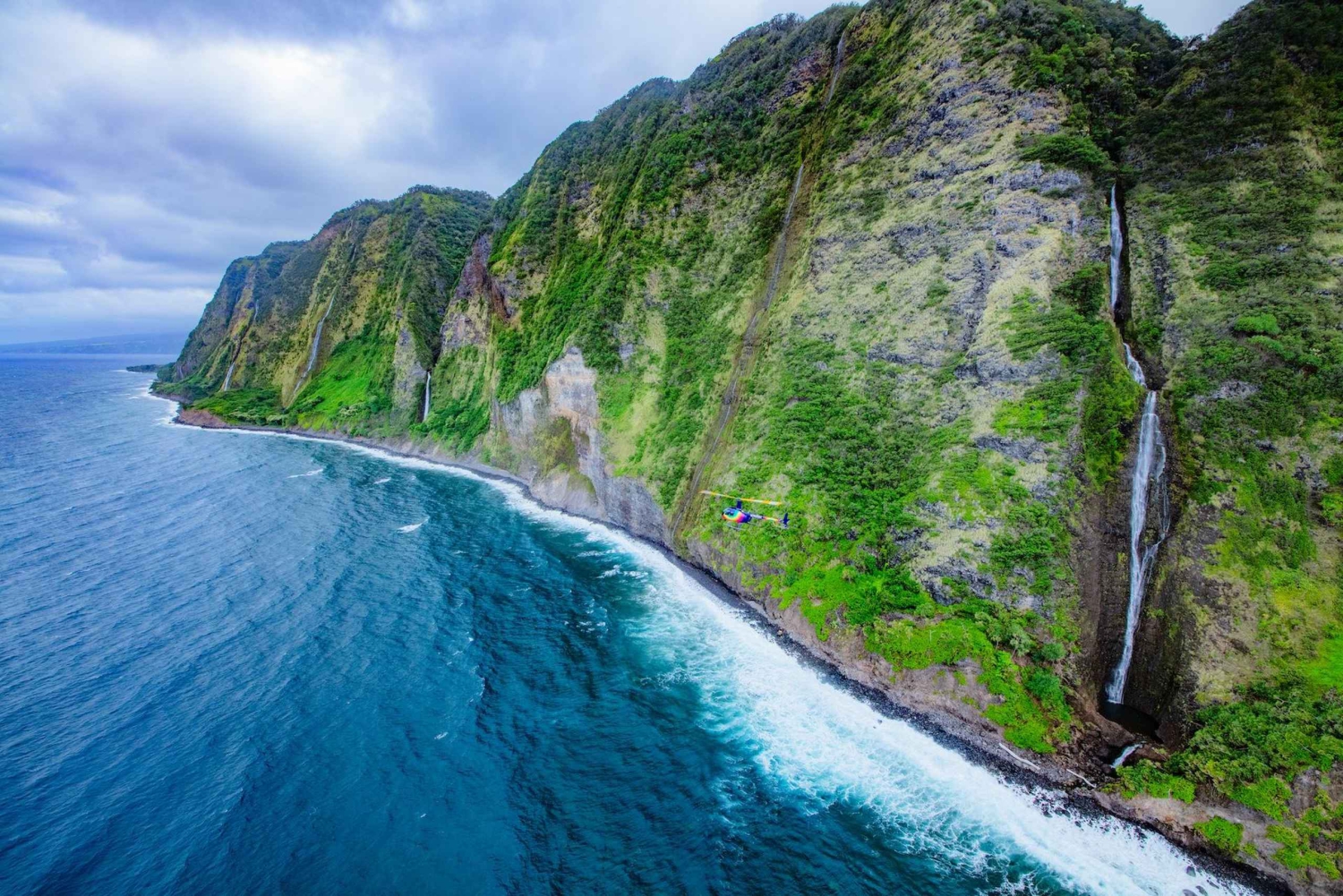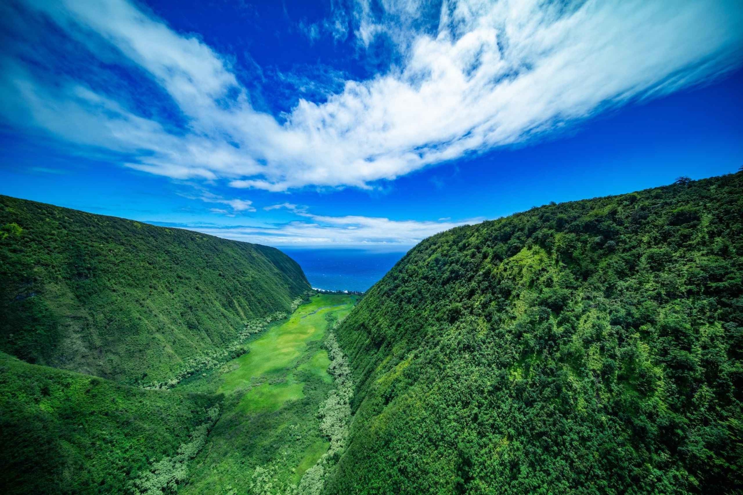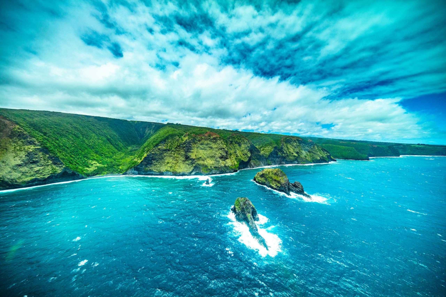 上空に戻り、緑豊かなポロル渓谷とワイマヌ渓谷、ラウパホエホエ ヌイ滝とワイリカヒ滝の流れる水をお楽しみください。ワイピオ渓谷の黒砂ビーチは、コハラ海岸沿いの最後の立ち寄りスポットです。その後、滝の跡をたどってアナエホオマル湾の黄金の砂浜、キホロ湾のアクアマリン色の海、そして人里離れた美しいマカラウェナビーチへと戻ります。