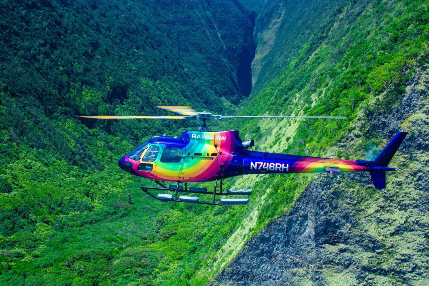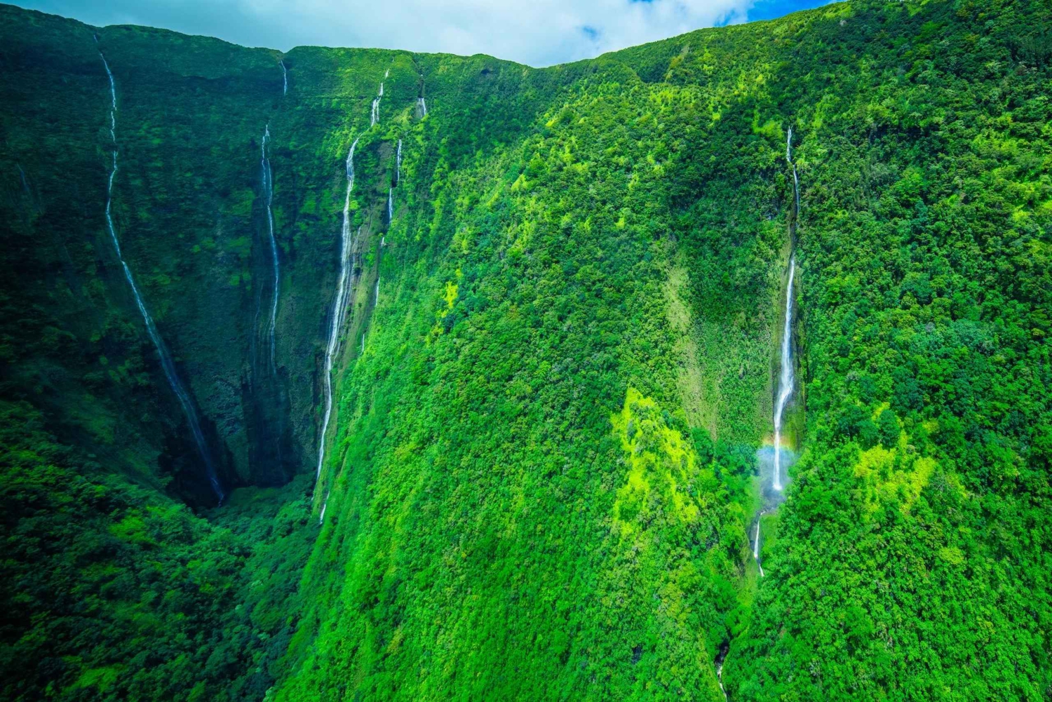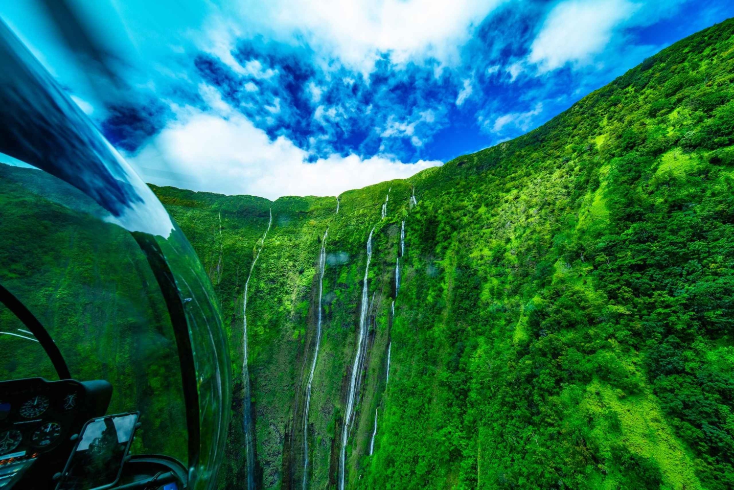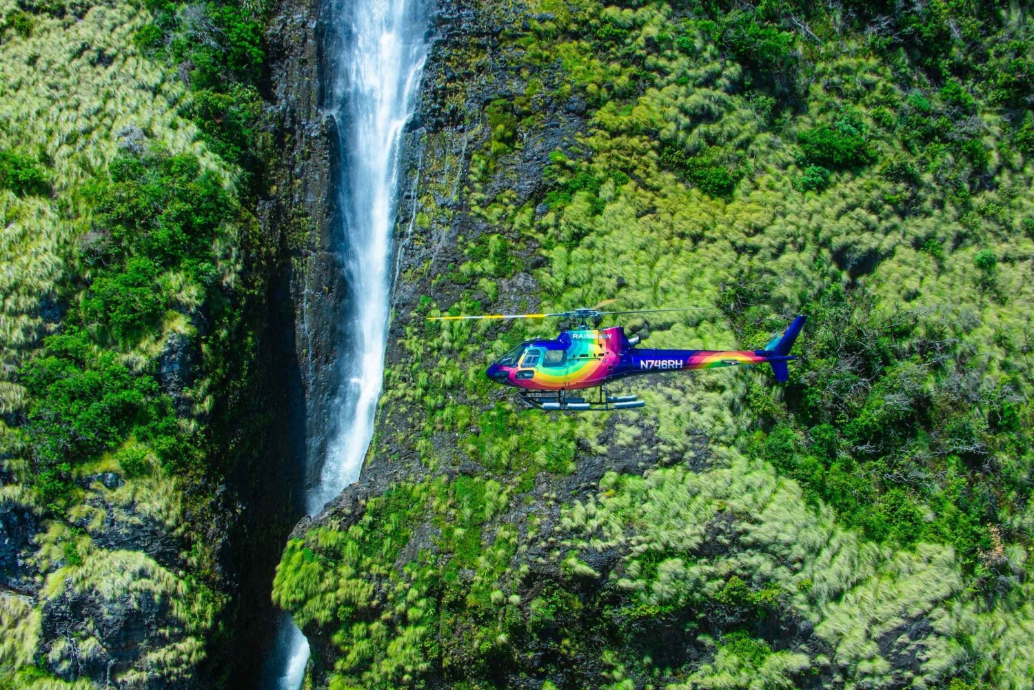 上空に戻り、緑豊かなポロル渓谷とワイマヌ渓谷、ラウパホエホエ ヌイ滝とワイリカヒ滝の流れる水をお楽しみください。ワイピオ渓谷の黒砂ビーチは、コハラ海岸沿いの最後の立ち寄りスポットです。その後、滝の跡をたどってアナエホオマル湾の黄金の砂浜、キホロ湾のアクアマリン色の海、そして人里離れた美しいマカラウェナビーチへと戻ります。