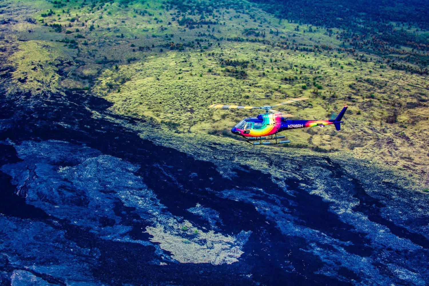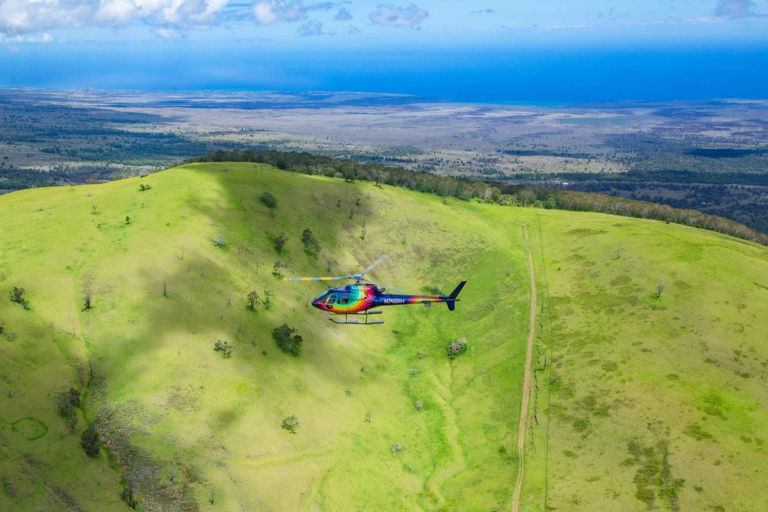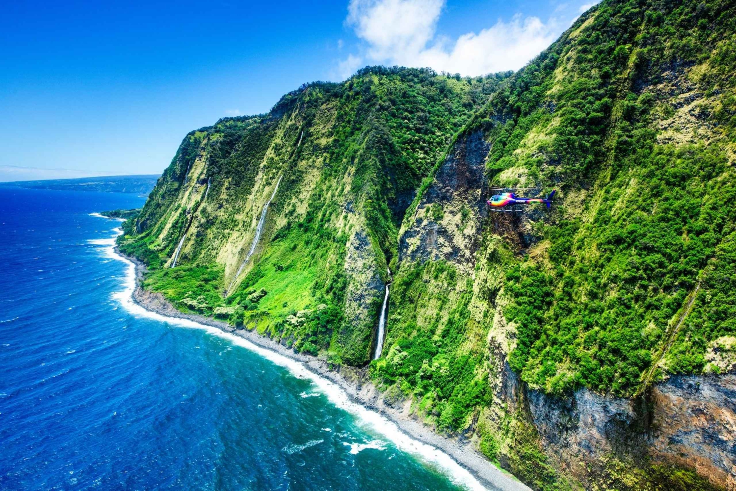 4 つの火山とコハラ コーストの滝を堪能できる、90 分間の素晴らしいヘリコプター ツアーを体験してください。ドアのオン/オフをお選びいただけ、海岸の風景、緑豊かな森林、火山の風景が融合した景色をお楽しみいただけます。