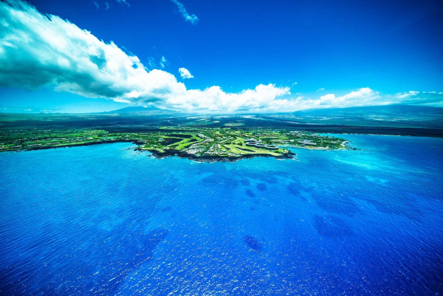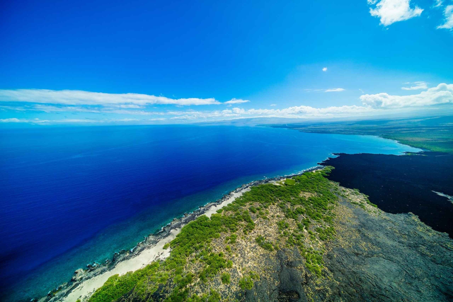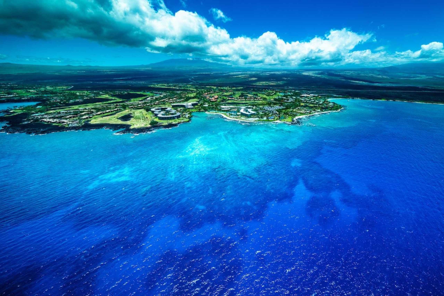 90 分間の飛行は、カイルア湾の透き通った海と鮮やかなサンゴ礁の上から始まります。湾を離れると、世界最大の活火山であるマウナ ロア (「ロング マウンテン」) が視界に現れます。飛行は、カウプレフ クレーターと印象的なフアラライ火山の素晴らしい特徴へと続きます。遠くには「ホワイト マウンテン」マウナ ケアが海抜 13,796 フィートでそびえ立ち、島の北半分を占めています。ハワイ島の 5 つの火山のうち最も古いコハラ火山が現れ、その火山地帯からプウ ワワア森林保護区が姿を現します。この森林には、固有の植物や動物が生息しています。森林を抜けると、息を呑むようなカワイハエ海岸とコハラ海岸が広がります。
