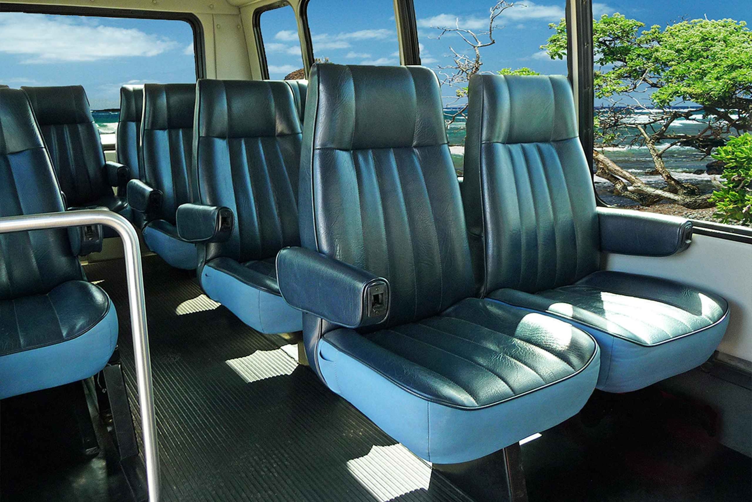 Dus leun achterover en ontspan in een verhoogde kapiteinsstoel en laat je betoveren door de schoonheid van Maui door de extra grote ramen. Reis door Maui in veiligheid, comfort en met een lokale stijl!