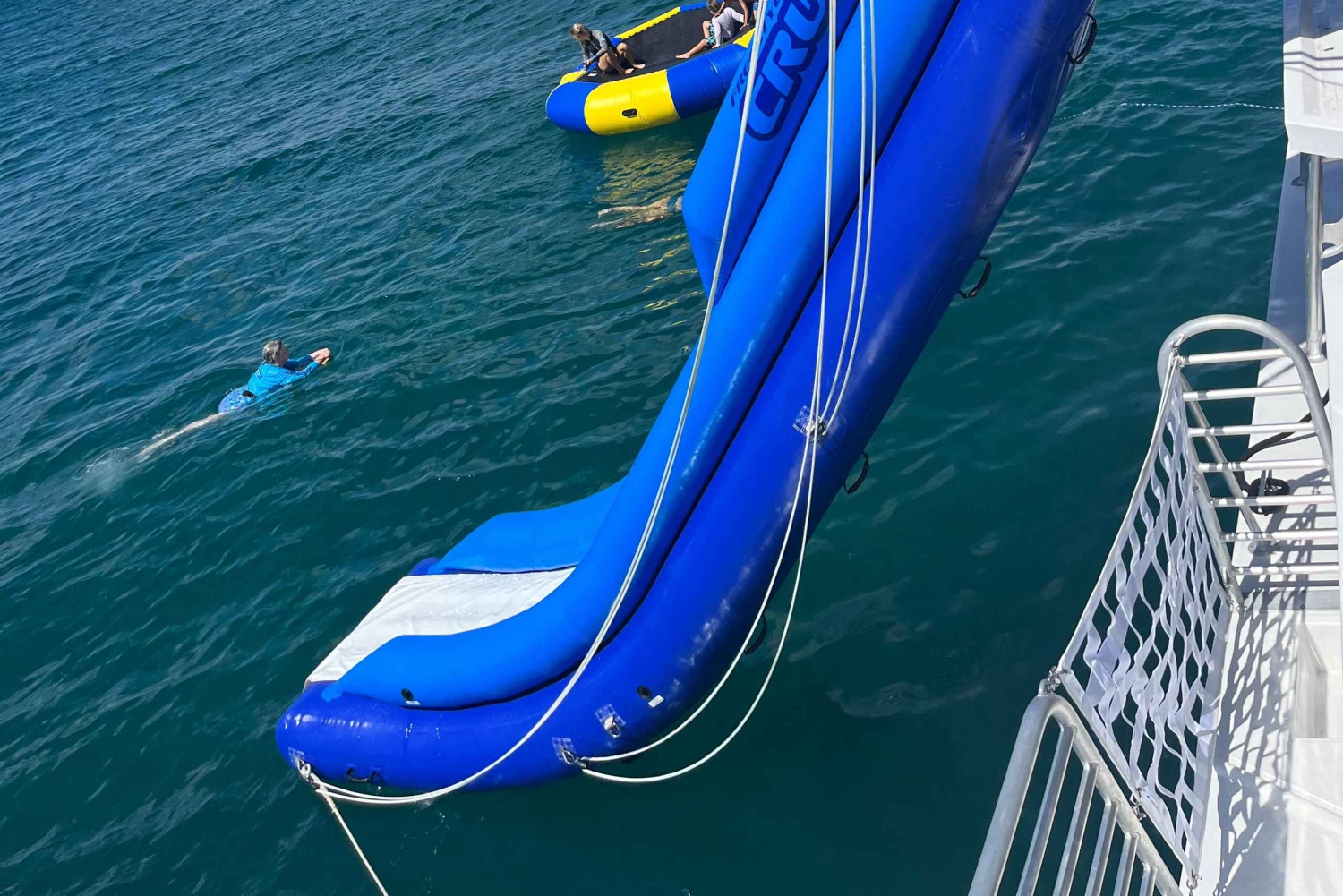 Snorkelutstyr er også tilgjengelig under hele utflukten, der du kan utforske et vakkert korallrev med et yrende marint liv. Du får tilgang til vår spennende 20-fots vannsklie og en hoppende vanntrampoline som får deg til å føle deg som et barn igjen. Hvis du foretrekker en mer avslappet opplevelse, kan du ta på deg en redningsvest og flyte forsiktig på de rolige bølgene og nyte havets stillhet.