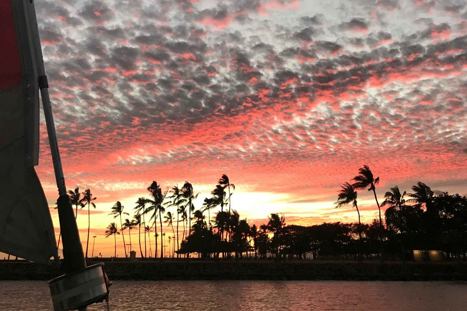 Seil fra Waikiki Beach og nyt en kort svømmetur i vannet utenfor Waikīkī Beach. Seil deretter langs den ikoniske Gold Coast mens himmelen forvandles til fantastiske farger som kaster et glitrende skinn over Waikīkīs skyline.