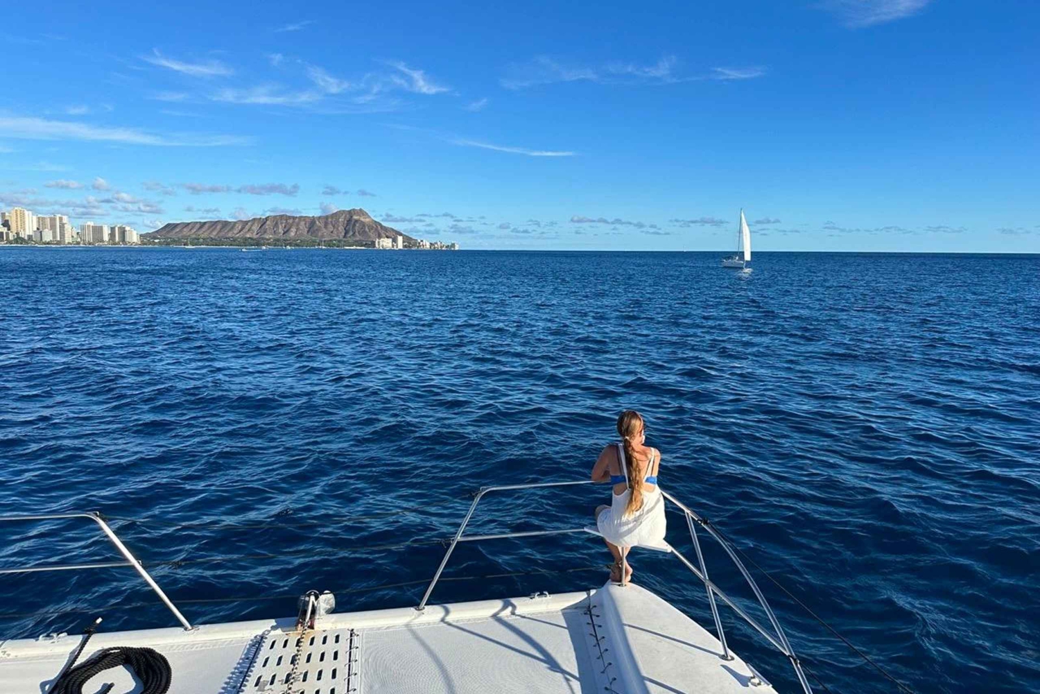 Etter en kort sikkerhetsgjennomgang kan du slappe av på den romslige, luksuriøse katamaranen vår mens vi cruiser langs sørkysten av Oahu til snorkelstedet Turtle Canyon.