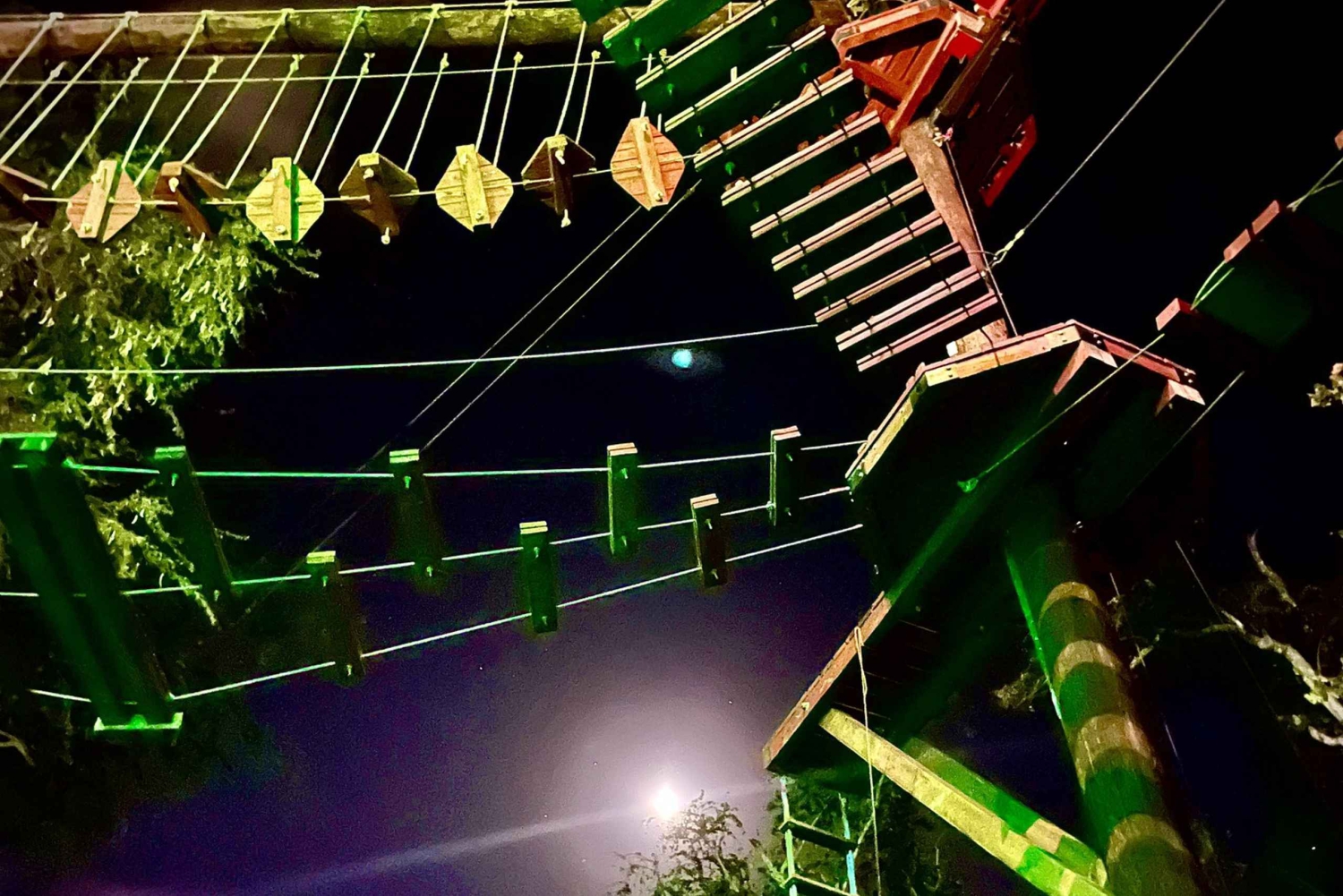Przygotuj się na niesamowitą imprezę pod neonami! Weź udział w nocnym kursie Aerial Challenge w Coral Crater Adventure Park.