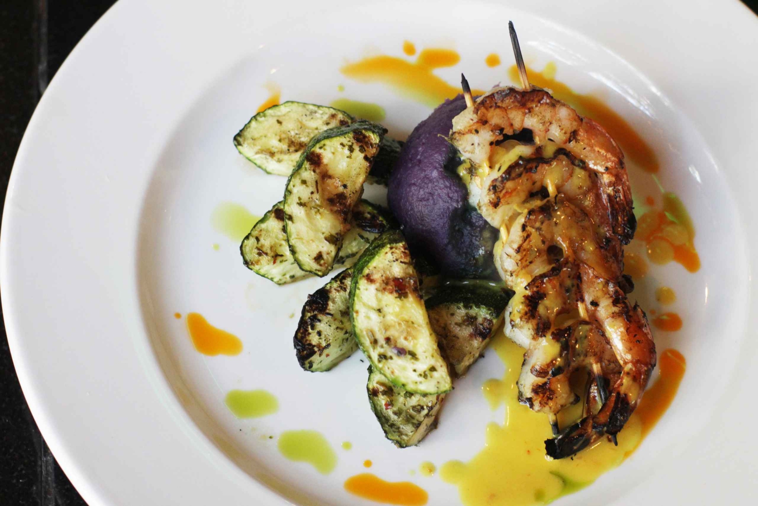 Danie grillowane do wyboru: marynowane w żółtym curry krewetki pochodzące ze zrównoważonych upraw i sos ze świeżego mango; pierś z kurczaka bez kości teriyaki z salsą z papai Big Island; duszone krótkie żeberko wołowe o zapachu trufli z grzybowym demi-glace); lub Grillowane grzyby Portobello marynowane w Chimichurri, na puree z fioletowych słodkich ziemniaków Molokai, podawane z medalionem z koziego sera w skorupce z orzechów makadamia, coulis z wędzonych pomidorów i zredukowanym balsamem balsamicznym (wegetariańskie)