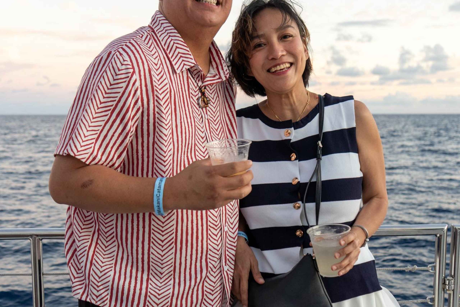 Wyrusz w spokojną podróż o zachodzie słońca Wypłyń katamaranem Makani na czarujący hawajski zachód słońca. Poczuj morską bryzę i delektuj się tropikalnym koktajlem, obserwując, jak słońce zanurza się pod horyzontem, oświetlając wody ciepłym bursztynowym odcieniem. Ikona Diamond Head i panorama Honolulu stanowią majestatyczne tło tego niezapomnianego dwugodzinnego rejsu.