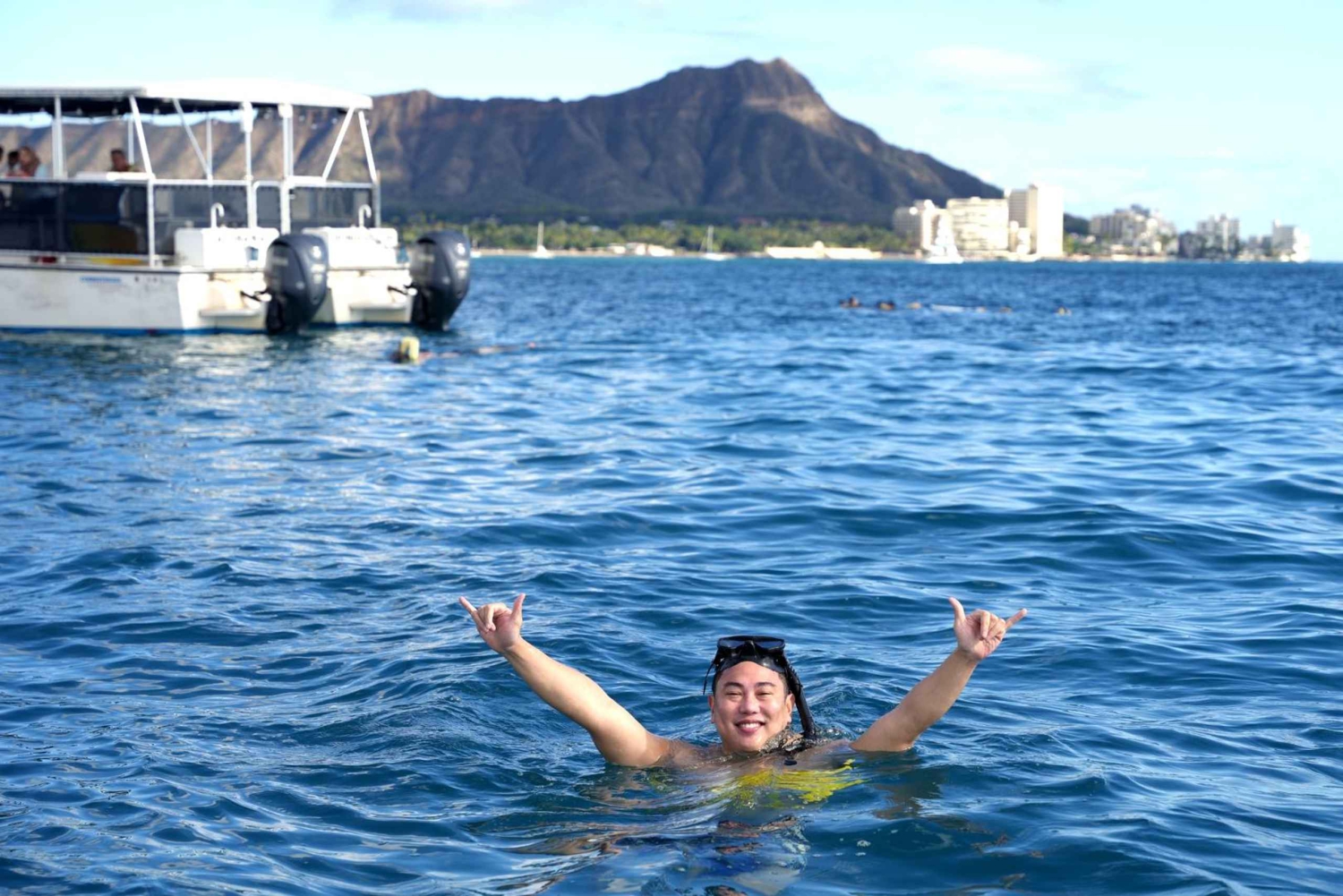 Odkryj zewnętrzne rafy Waikiki z załogą, która naprawdę dba o Twoje wrażenia, wyruszając z portu Kewalo. Ucieknij od zatłoczonych łodzi; nasza 50-osobowa łódź jest ograniczona do 25 pasażerów podczas tej wycieczki, aby zapewnić Ci komfort i poświęcić Ci uwagę, na którą zasługujesz. Ten 2-godzinny rejs wycieczkowy zabierze Cię wzdłuż wybrzeża z Honolulu do Turtle Canyon, specjalnej rafy, gdzie mieszkają ryby, które oczyszczają żółwie morskie z glonów. Zapewniamy cały sprzęt, kamizelki ratunkowe i instrukcje do snorkelingu. Nasi dwaj certyfikowani ratownicy wodni oprowadzą Cię po rafie, dzieląc się informacjami o morskiej przyrodzie, którą zobaczysz, i zapewnią Ci rozrywkę podczas snorkelingu trwającego do 1 godziny.