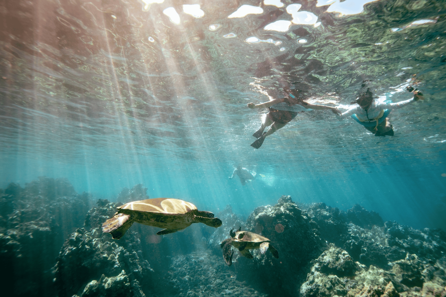 Prepare-se para encontrar as majestosas tartarugas marinhas verdes gigantes do Havaí, conhecidas como Honu, juntamente com uma variedade de vida marinha vibrante, incluindo peixe-porco de recife, peixe-estrela, peixe-borboleta, polvo, arraias, enguias e muito mais em Turtle Town, Coral Garden e/ou Olowalu Reef.