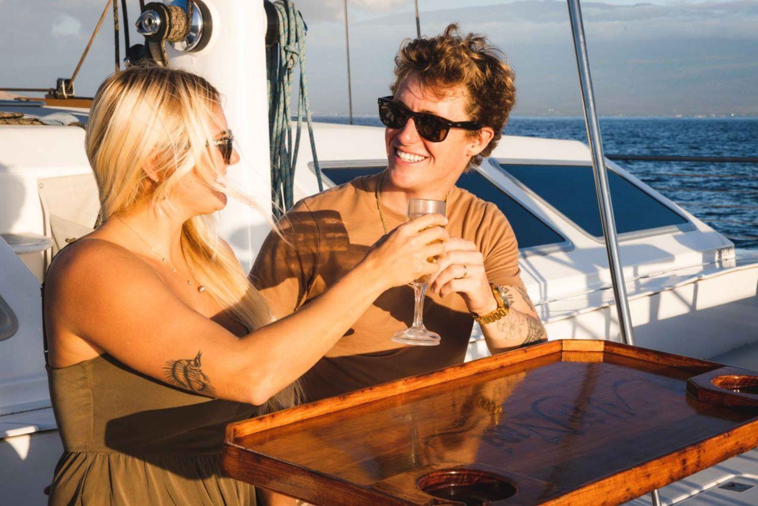 Saboreie mimosas havaianas, Aperol Spritz e cervejas artesanais da Maui Brewing Co. enquanto aprecia a brisa do mar e as vistas panorâmicas. Após um mergulho refrescante, delicie-se com um generoso almoço buffet ao estilo da ilha servido a bordo.