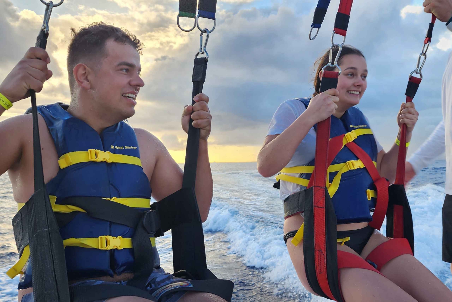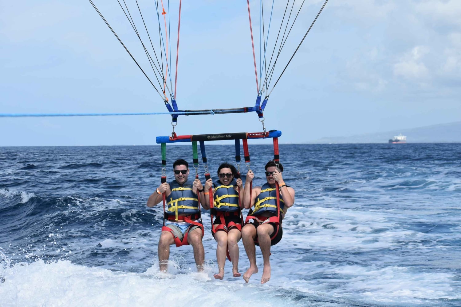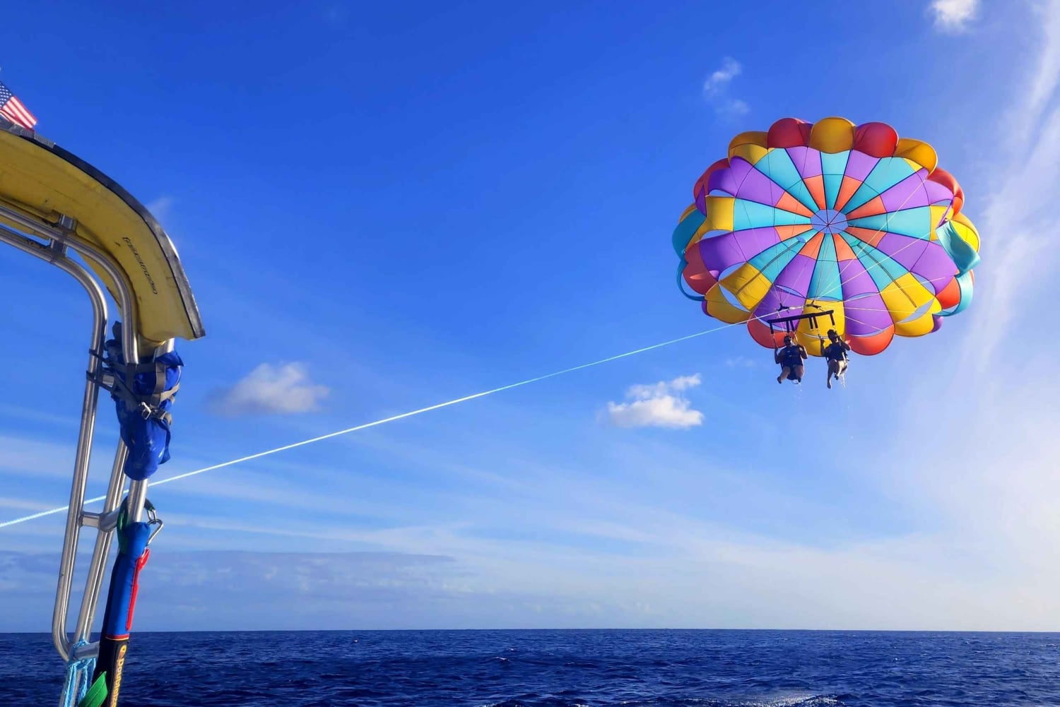 Участвуйте в захватывающем приключении на парасейлинге над золотыми пляжами Оаху, кристально чистыми водами и ярким городским пейзажем, наслаждаясь редким видом на культовую Алмазную Голову с высоты птичьего полета.