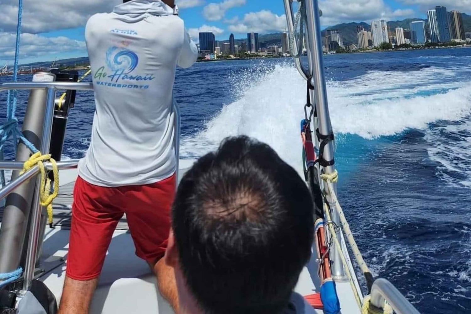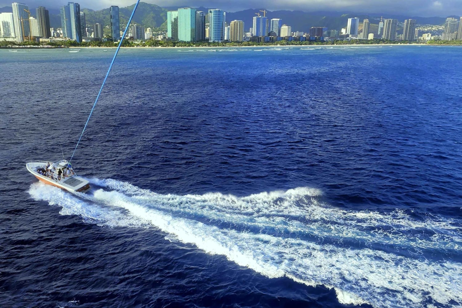 Отправьтесь в приключение на парасейлинге над глубокими синими водами Гонолулу и испытайте головокружительный полет с захватывающими панорамными видами на яркий городской пейзаж и природные красоты Оаху.