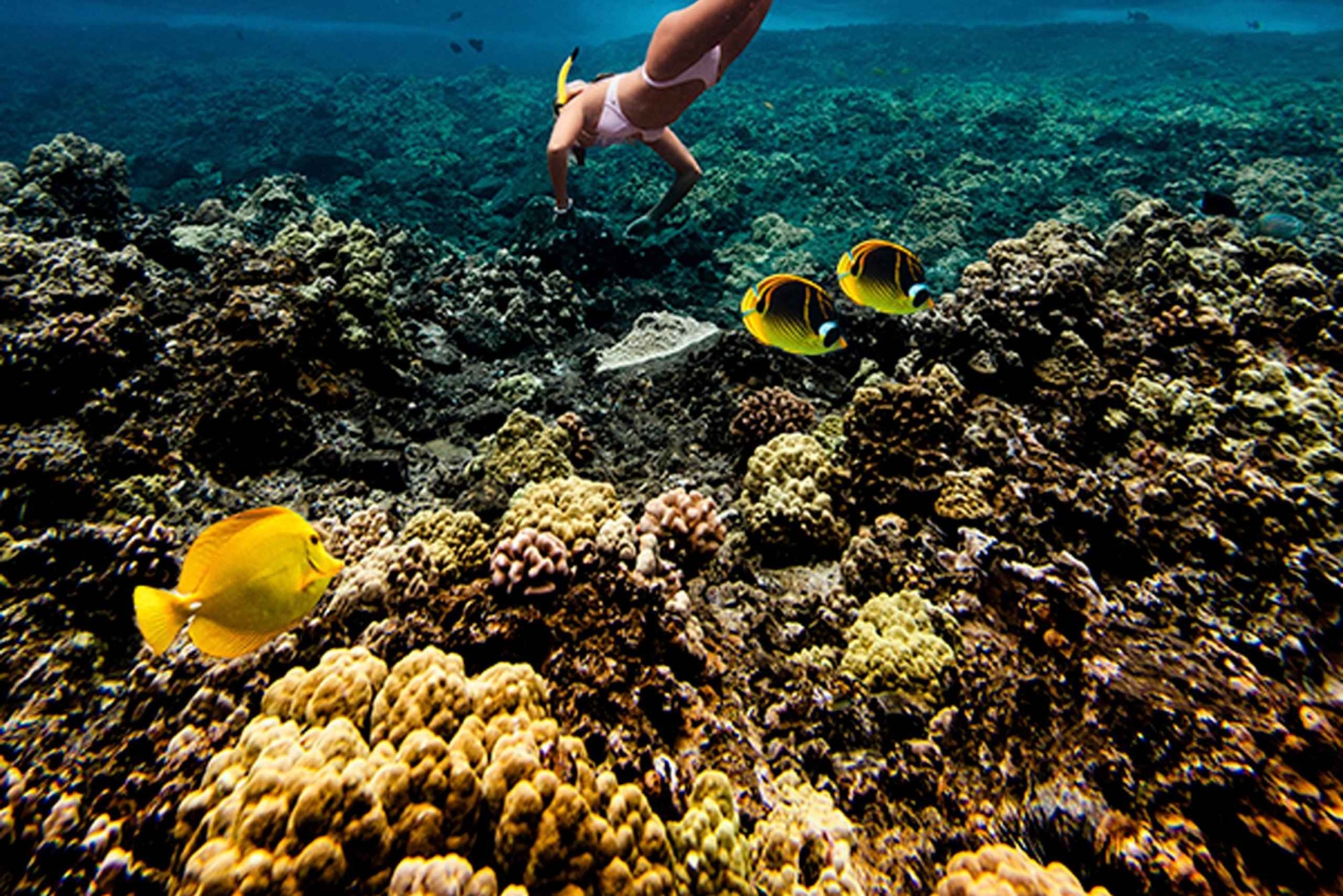Прибытие на побережье Ланаи, уединенное место для сноркелинга со спокойными, кристально чистыми водами, изобилующими яркими коралловыми рифами и разнообразной морской жизнью. Независимо от того, исследуете ли вы подводный мир или отдыхаете на палубе, каждый момент является праздником необыкновенной природной красоты Мауи.