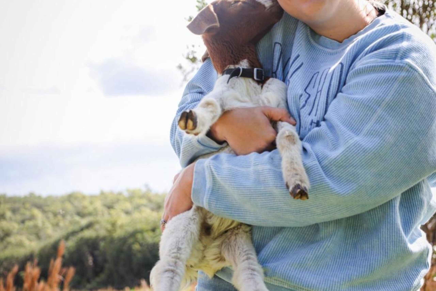 Gosa, klappa och lek med getterna i ett avslappnat, skuggigt område medan du tar massor av foton.