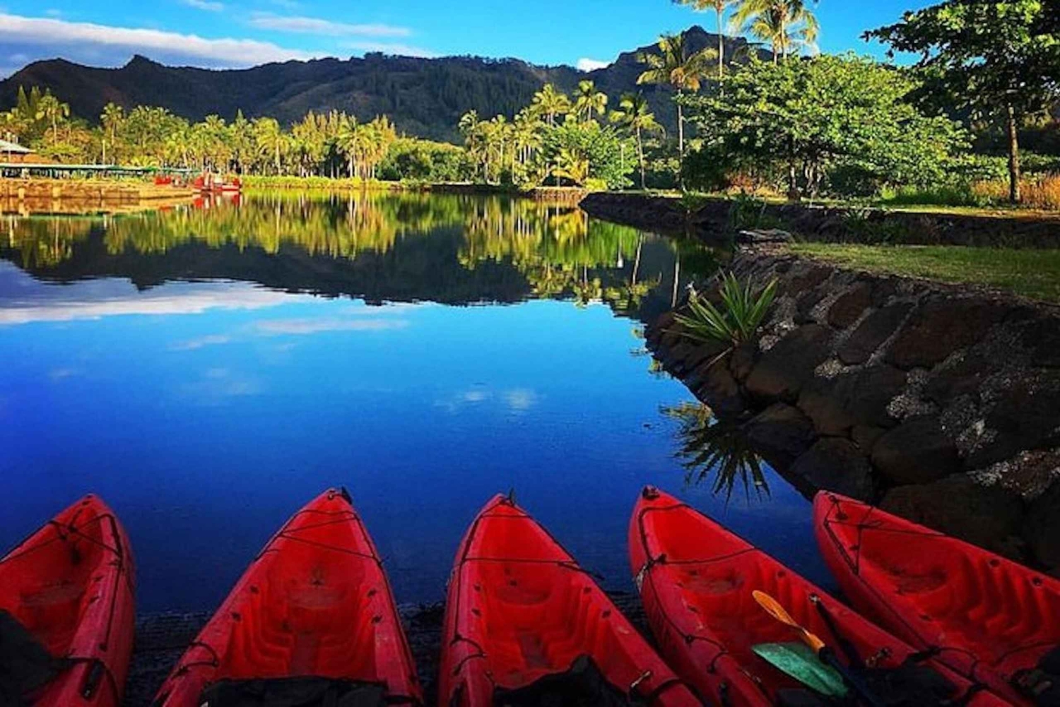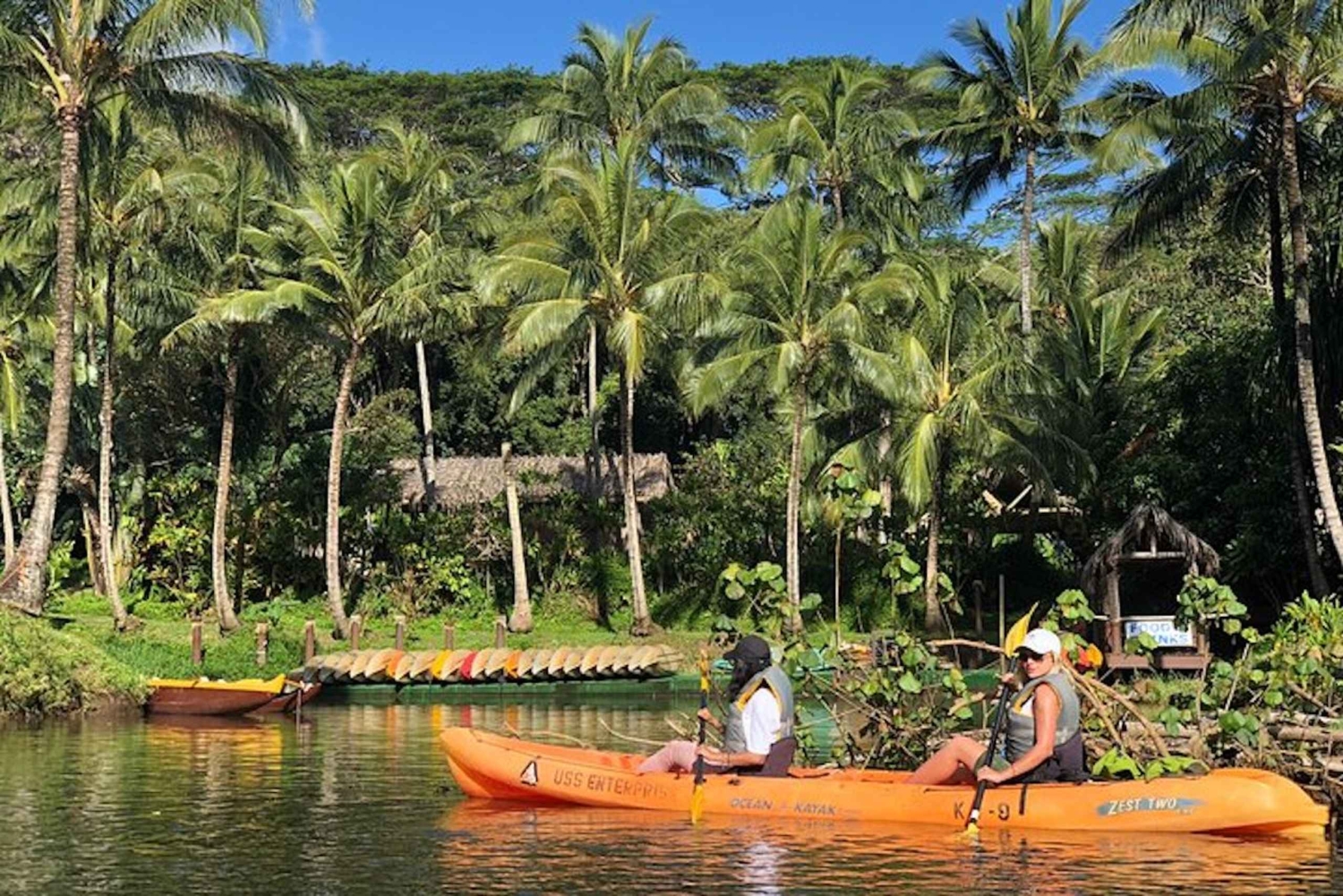 Paddla kajak, vandra, utforska och lär dig allt på ett Kauai-äventyr. Börja din dag på Wailua River. Din guide instruerar dig när du paddlar genom det smaragdgröna vattnet och lär dig historien om hawaiianerna som anlände för 1 500 år sedan. Lyssna på deras legender och utforska floran och faunan runt omkring dig. Njut av utsikten över de häpnadsväckande och vackra klipporna i Wailua, och ta dig sedan till byn Kamokila, en kopia av en gammal hawaiiansk by. Paddla genom det heliga området till North Fork och genom regnskogen innan du hoppar ut. En måttlig vandring tar dig djupt in i djungeln och till ett 36 meter högt vattenfall. Tillbringa lite tid i paradiset och njut av lunch och tid med din guide. Detta är en resa på cirka 6 timmar som passar äventyrare från 5 till 75 år. Deltagare bör vara bekväma i vatten, gilla att vandra samt vara i god fysisk form. Räkna med cirka 6 km paddling och drygt 1,5 km vandring. Vandringsleden kan vara både hal och lerig ibland. Du måste kunna gå 2,5 km och kajak 60-90 minuter.Includes