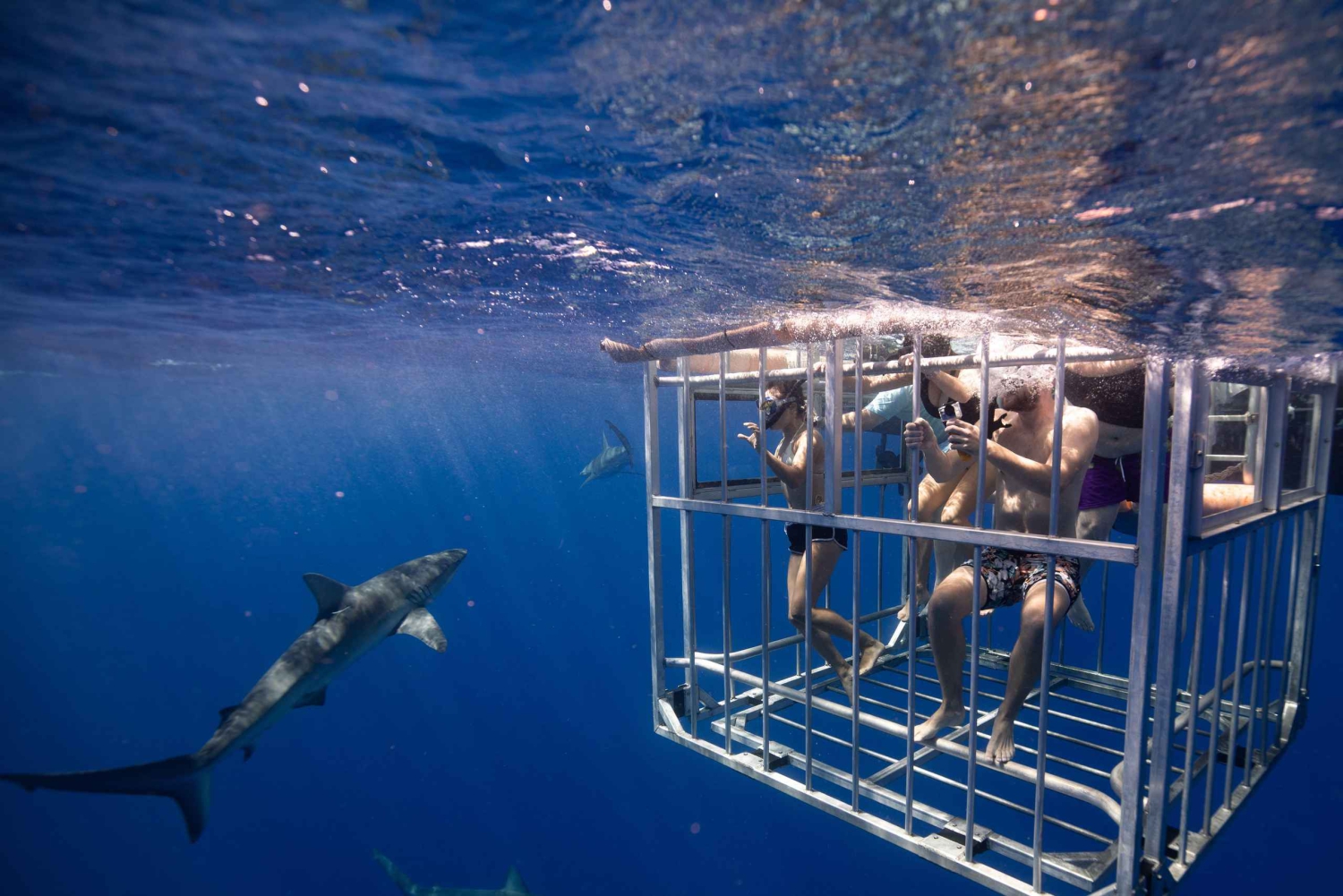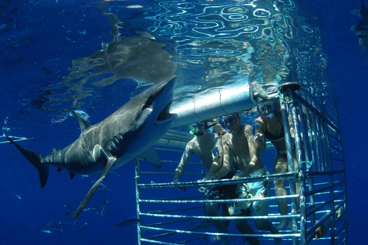 Möt din guide i hamnen och gå ombord på båten. Åk 3 miles offshore ut i det öppna havet. När du tittar in genom burens stora plexiglasfönster ser du hajar som glider graciöst i sin naturliga miljö. Deras nyfikenhet för dem nära fönstret, vilket möjliggör ett fascinerande möte öga mot öga.